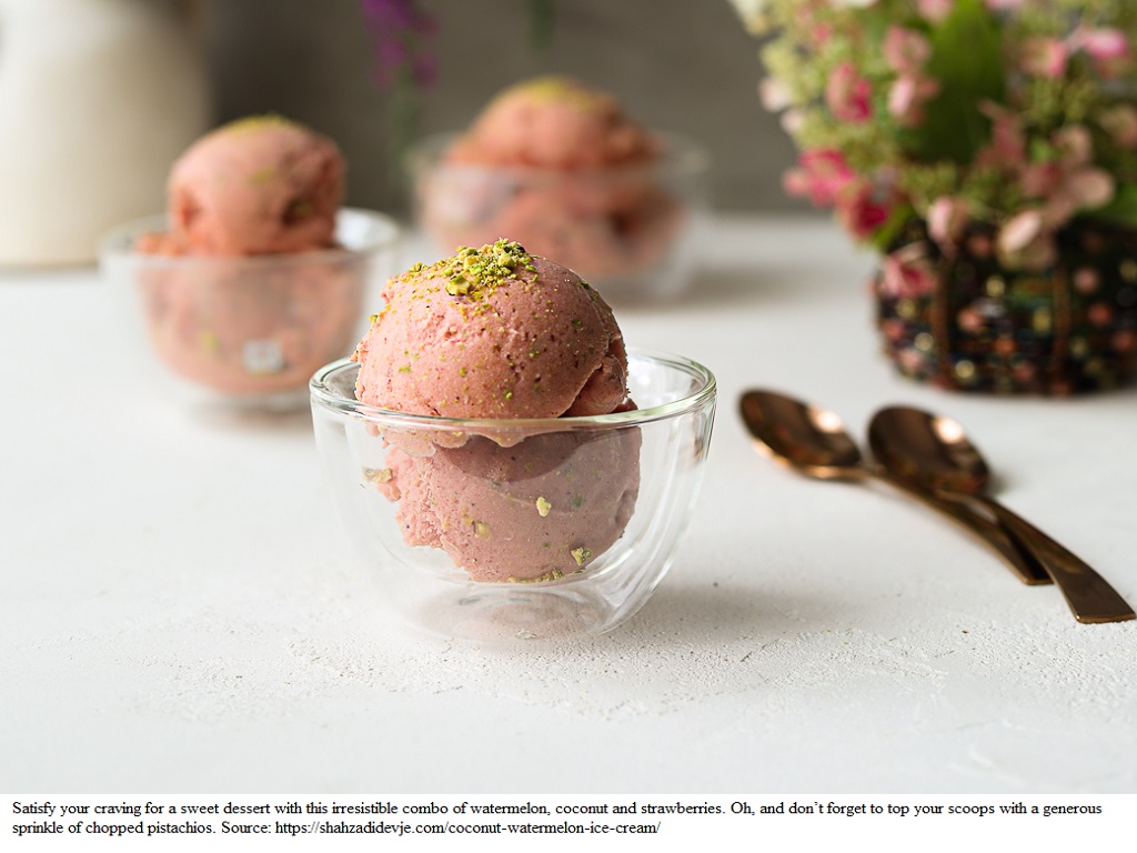 Beat the heat with this easy and healthy Coconut Watermelon Ice cream by Desi~licious RD, Shahzadi Devje. Made with only five ingredients (zero added sugar!) and no churning required.