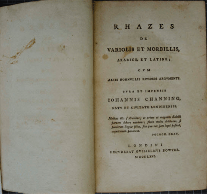 This text was translated into Latin as De variolis et morbillis and became “a landmark in the development of the concept of specific disease entities and the value of diagnostic precision” (The Medical Influence of Rhazes, Encyclopedia.com).