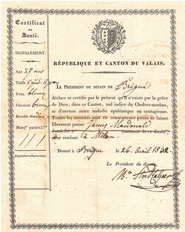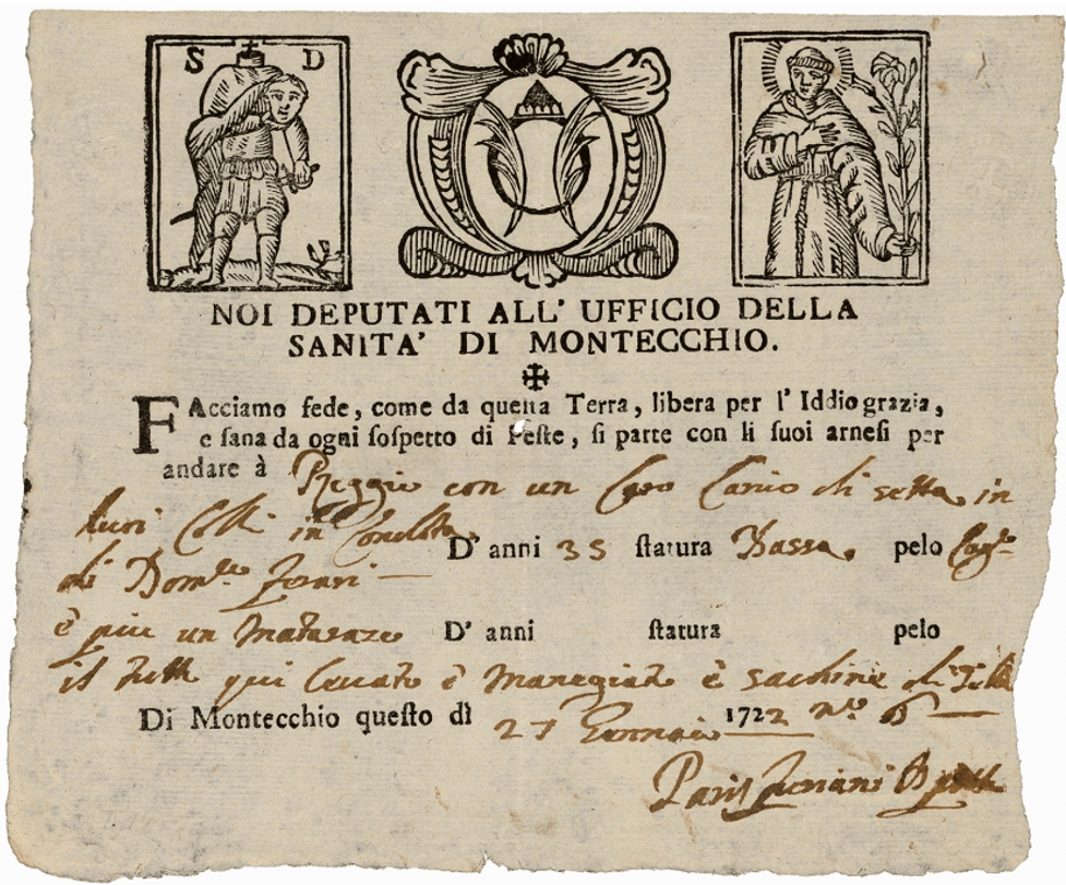 A health pass issued by officials of Montecchio in Italy in 1722 promises that since their land “is, by the grace of God, free and safe from any suspicion of the plague,” the bearer may depart from Reggio.