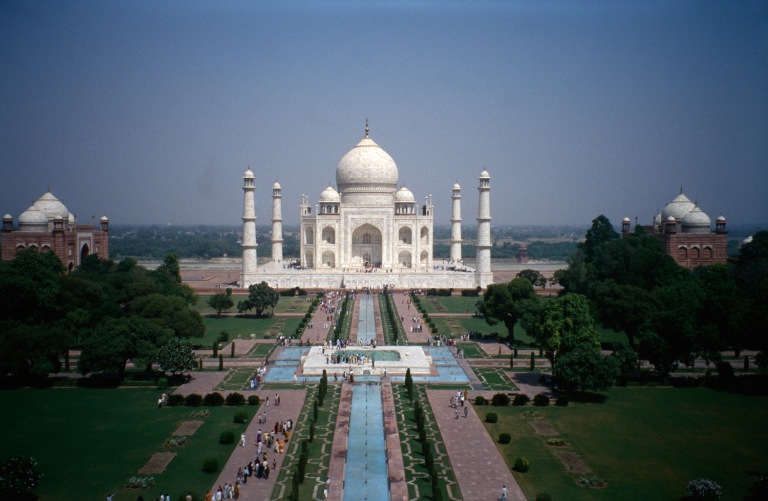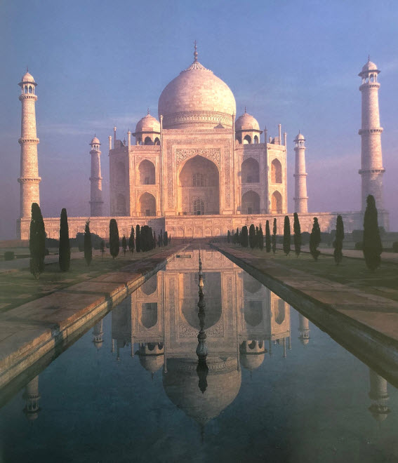 At the Taj Mahal, the mausoleum overlooks the river rather than being in the centre; perhaps its reflection in the water channel “enhances the mystical metaphor of reflection and veils of reality” (Vaughan, Islam Art and Architecture, p. 480).