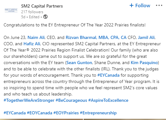 On June 23, Naim Ali, CEO; Rizvan Bharmal, CFO; Jamil Ali, COO; and Hafiz Ali, CIO represented SM2 Capital Partners at the EY Entrepreneur of the Year 2022 Prairies region finalists celebration.