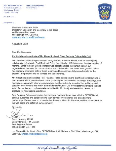 Mr. Minaz Jivraj, Chief Security officer, Dufferin Peel Catholic District School Board (Ontario, Canada), was recognized by the Board of Trustees at a public meeting on August 27, 2020 in a letter by Peel Regional Police Service for his assistance during several significant investigations, many of which involved violent crime (including but not limited to shootings, stabbings, and homicides), along with other events/incident that have directly impacted the wellbeing and safety at local schools and within the broader community. Mr. Jivraj was recognized for his “high level of expertise and professionalism.”