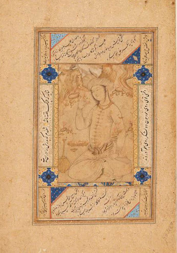 The texts on the right and left sides of the above painting are from the Persian poet Sa’di’s Gulistan, (‘Rose Garden‘), considered a landmark of Persian literature, written in 1258 CE. It is one of two major works of Sa’di (d. 1291), one of the greatest medieval Persian poets.