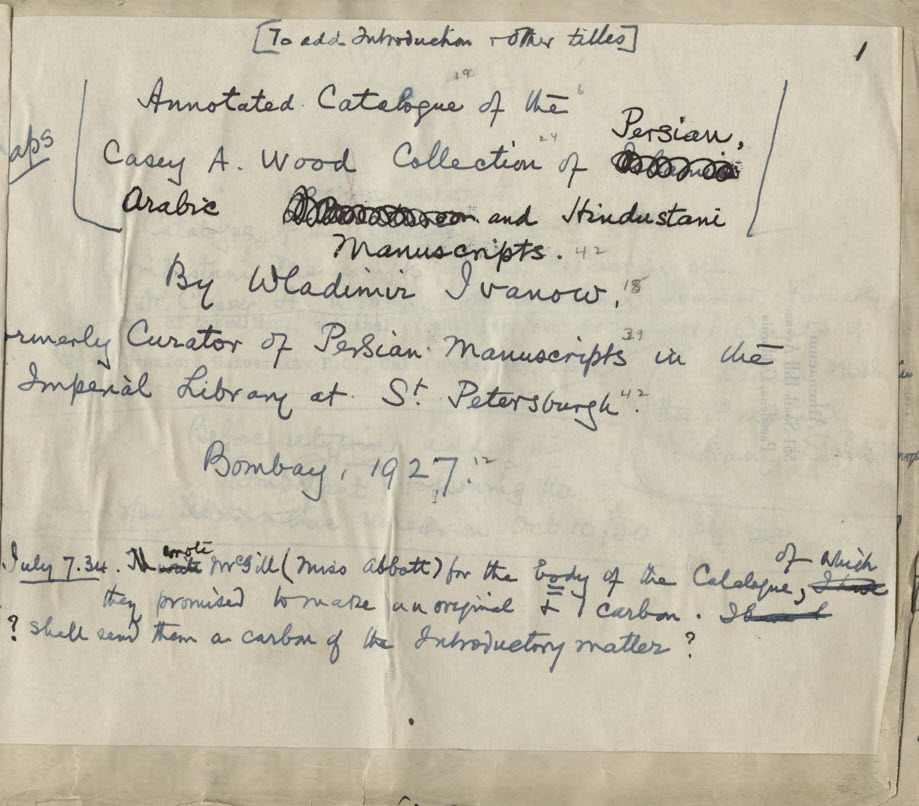 The revised title page dated Bombay, 1927; the “rough notes” title page is dated Calcutta, India, 1928 and has Wood’s manuscript notations re publication possibilities dated 1934. Image: Annotated catalogue of the Casey A. Wood Collection of Persian, Arabic, and Hindustani manuscripts; Sarah Severson/The Dark Room, McGill Digitized Library