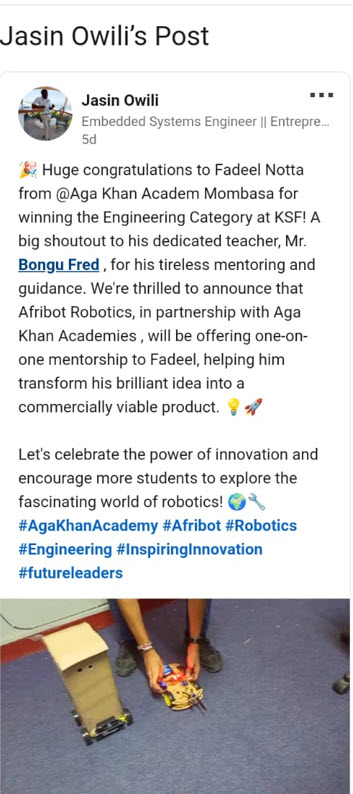 Fadeel came in second in the regional science competition held in Taita, Kenya. He will enter the national competition to be held in Kisumu. Fadeel also won the engineering category at KSF.