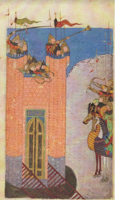 A depiction of he Mongol seige of Alamut from a copy of the Ta’rikh-i jahan-gusha of Ata Malik Juwayni (d. 1283). Image: Daftary, The Ismaili Imams