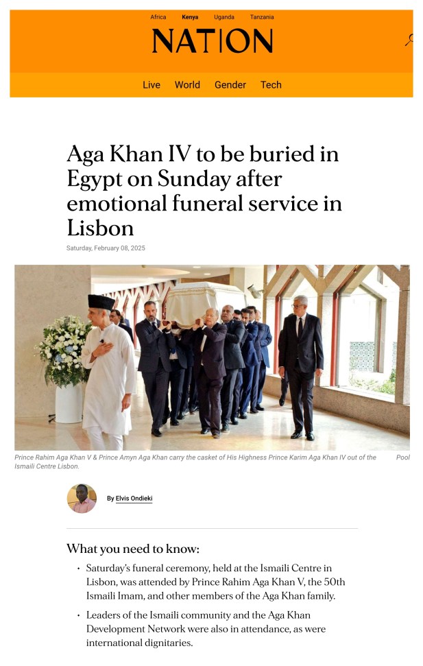 Source: Nation.Africa. Aga Khan IV to be buried in Egypt on Sunday after emotional funeral service in Lisbon