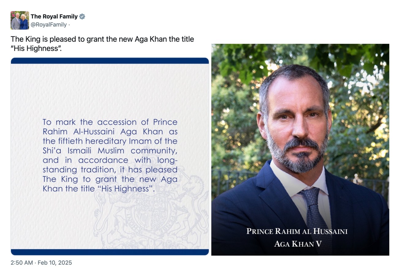 Laura Elston, PA Court Reporter, February 10, 2025. The King has granted the new Aga Khan the title “His Highness”, Buckingham Palace has announced.