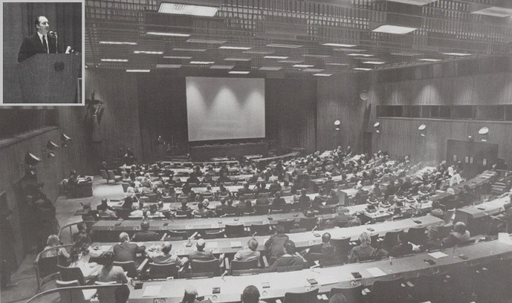 “Service to the world community is a family tradition for His Highness”, declared the UN Secretary General Kurt Waldheim as he welcomed Mawlana Shah Karim to the United Nations on December 11, 1980. The Aga Khan was provided a forum to share the first results of ongoing research for a contemporary new Muslim architecture at the Trusteeship Council Chambers which were crowded with UN diplomats, architects, journalists and others for the special event. Fittingly, the event was sponsored by the United Nations Development Program, the agency responsible for building the physical and economic infrastructures in the developing world, which was at that time led by Bradford Morse. Photograph: Ismaili Forum, UK, July 1981, via Barakah
