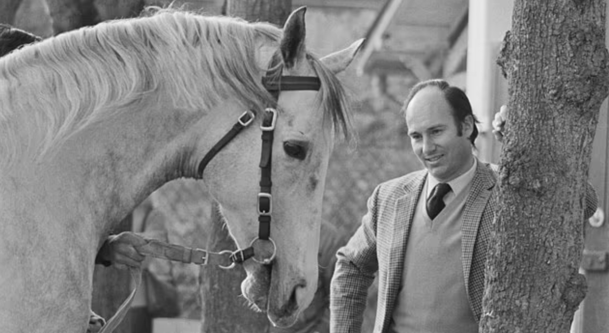 1973: His Highness Prince Karim Aga Khan IV, wearing a tweed jacket over a sweater with a shirt and tie, as he stands with his horse Zeddaan in 1973. Image credit: Getty Images