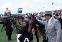Ascot, UK. June 17, 1999: His Highness Prince Karim Aga Khan IV (R) owner of Irish horse Enzeli with Irish Jockey Johnny Murtagh (L) after winning the Gold Cup at Royal Ascot. Image credit: Trevor Jones / Popperfoto via Getty Images