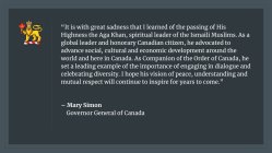 Canada Governor General Mary Simon April 15, 2025 Global: Why the World Celebrates His Late Highness Prince Karim Aga Khan IV | Constellation of Honours: Over 300 Accolades from 55 Countries 1600 × 900 Message from the Governor General of Canada, Mary Simon on the passing of His Highness Prince Karim Aga Khan IV Message from the Governor General of Canada, Mary Simon on the passing of His Highness Prince Karim Aga Khan IV