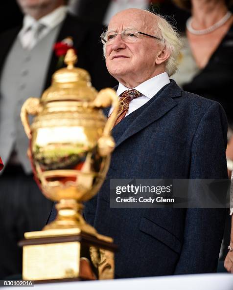 Dublin , Ireland. August 11, 2017: Uachtarán na hÉireann Michael D Higgins stands behind the Aga Khan Trophy during the Parade of Teams ahead of the FEI Nations Cup during the Dublin International Horse Show at RDS, Ballsbridge in Dublin. Image credit: Cody Glenn/Sportsfile via Getty Images