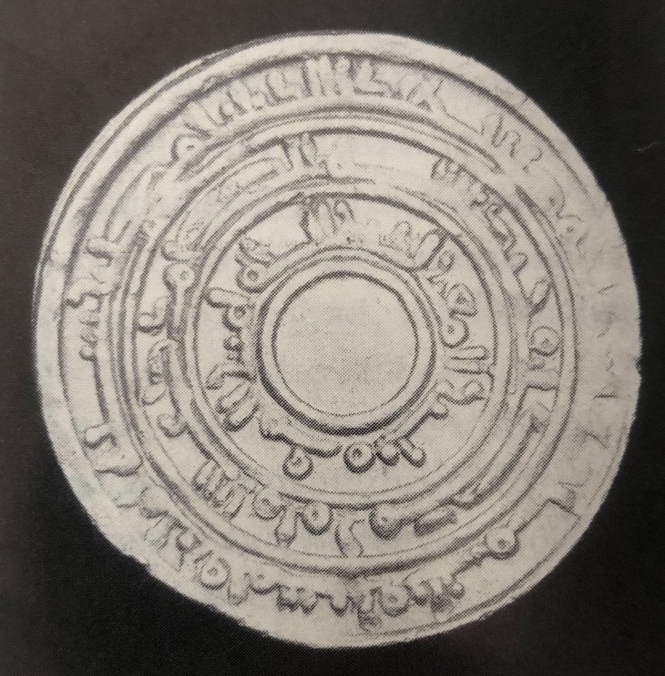 Walker states that Imam al-Mansur began a distinctive Fatimid style “that featured concentric circles of writing around a central field with a horizontal inscription” (Exploring an Islamic Empire p 96). Imam Al-Mu’izz further changed the design and included Shi’i content in the inscription. He dropped the horizontal field in favour of three concentric circular bands of writing centred around a dot, illustrating that all things originate from the dot, the centre, although no specific information was provided for the changes. (Walker, Exploring an Islamic Empire p 97).