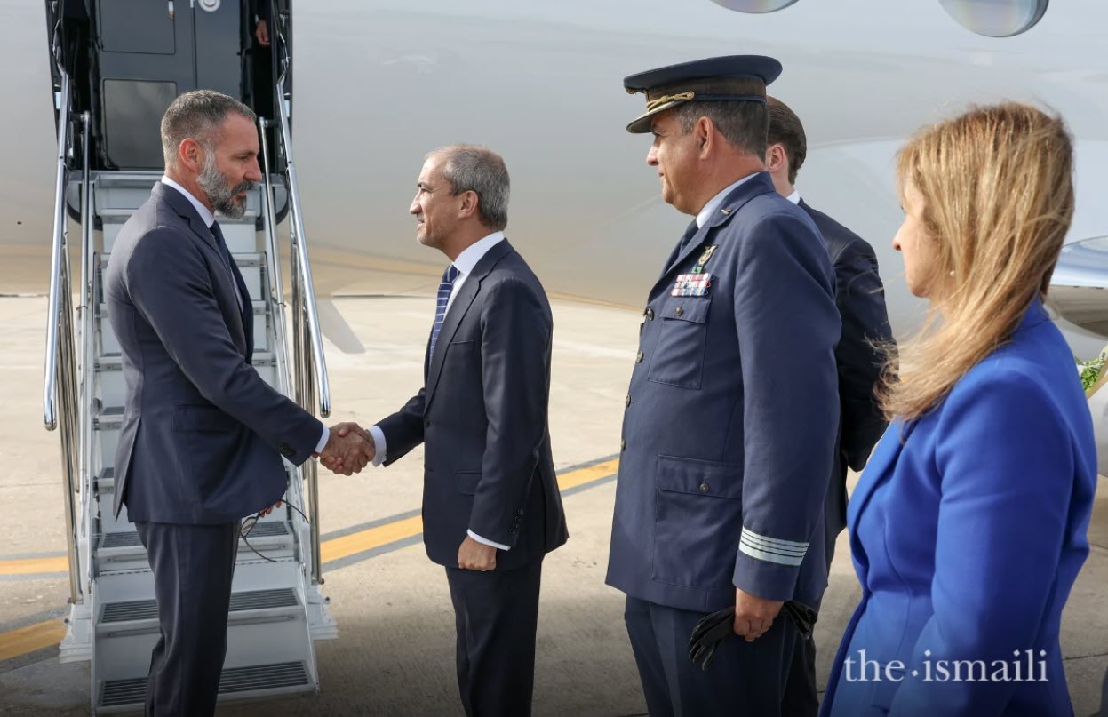 Mawlana Hazar Imam was received by Ambassador Francisco Vaz Patto, Head of State Protocol; Prof. Francisco Proença Garcia, Chairman of the Portuguese Delegation to the Seat Agreement Joint Committee; Yasmin Bhudarally, President of the Ismaili Council for Portugal; and Nazim Ahmad, Diplomatic Representative of the Ismaili Imamat to Portugal. A delegation of leaders were also present to welcome Hazar Imam on behalf of the Jamats of Portugal and Spain.