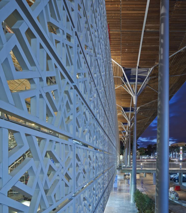 It is a cylindrical volume that measures 45m in diameter. The steel and concrete structure follows a diamond shaped grid that bends along the virtual surface of the cylinder. The façade uses a double skin system. The exterior skin is composed