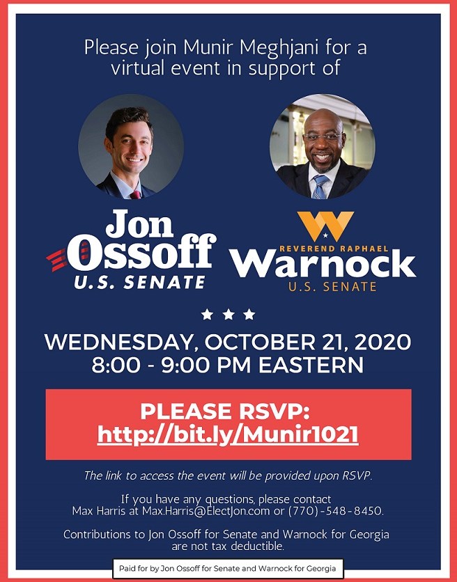 Ismailis Rise Up Virtual Event: Town Hall with U.S. Senate candidates Jon Ossof (Georgia, U.S.) and Rev. Raphael Warnock (Georgia, U.S.) Wednesday October 21, 2020